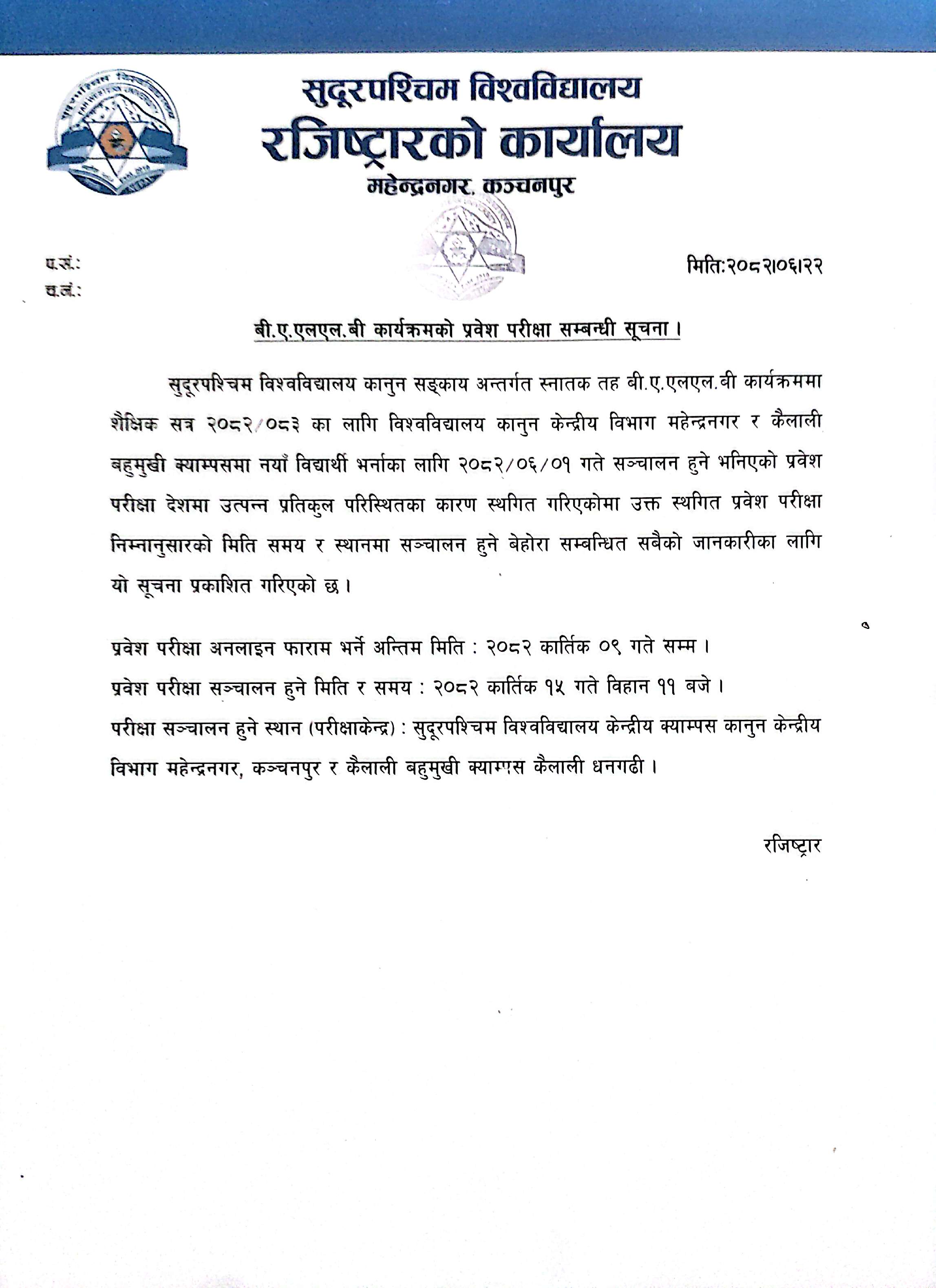 Reschedule new notice of B.A.LL.B Entrance Exam 2082